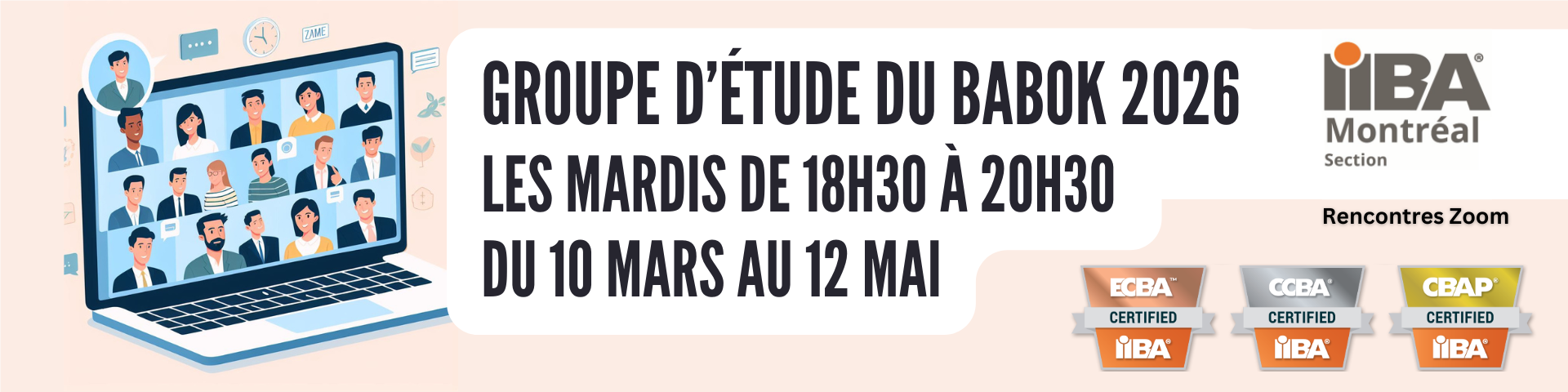 Bonne nouvelle pour celles et ceux qui souhaitent se préparer à une certification IIBA, notre groupe d’étudedébute le 10 mars !